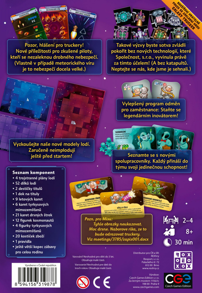 Galaxy Trucker: Jedeme dál! je rozšíření k druhé edici populární vesmírné hry Galaxy Trucker. Hráče v něm čeká spousta nového obsahu, od nových a složitějších lodí před nové dilky lodí s novými efekty či třeba tyrkysové marťany se speciálními schopnostmi. V krabici najdete i 9 nových letových karet a také 21 karet drsných štrek. Prostě všechno, co pořádný fanoušek hry Galaxy Trucker potřebuje pro to, aby čelil ještě větším výzvám!