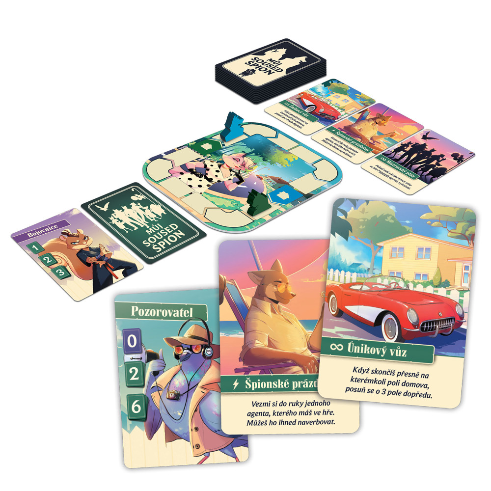 Můj soused špion je rychlá deduktivní hra pro dva až čtyři hráče, kteří se budou snažit přechytračit své protivníky. Hra obsahuje karty s různými efekty či bodovými hodnotami, přičemž hráč na tahu nabízí kartu skrytě a odkrytě a druhý si volí, kterou z nich si vezme. Hra je závod okolo bloku a karty s vysokou hodnotou vám dovolí přiblížit se k protivníkovi. Některé karty mají hodnotu až v rámci sady, ale vyplatí se na ně počkat. Hra Můj soused špion má roztomilé ilustrace, jednoduchá pravidla, ale pořádně procvičí vaše blafovací schopnosti i odhad!