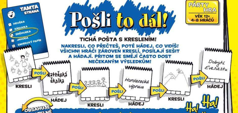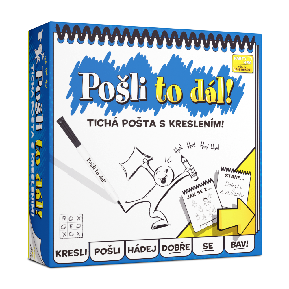 Pošli to dál! je zábavná párty hra, ve které si vyzkoušíte své kreslířské i hadačské schopnosti! Hra je podobná známé tiché poště, nicméně hráči si zde nešuškají slova, ale střídají se v kreslení a hádání. Hráči si tak nejprve přečtou tajné slovo a pak se ho pokusí nakreslit. Sešit pošlou dále a v dalším kole všichni hráči napíšou, co si myslí, že kresba představuje. Další hráč opet kreslí slovo, které se k němu dostalo. No a po několika kolech z toho často vyleze něco úplně jiného, než na začátku! Pošli to dál! je ideální párty hra se superjednoduchými pravidly a spoustou zábavy!