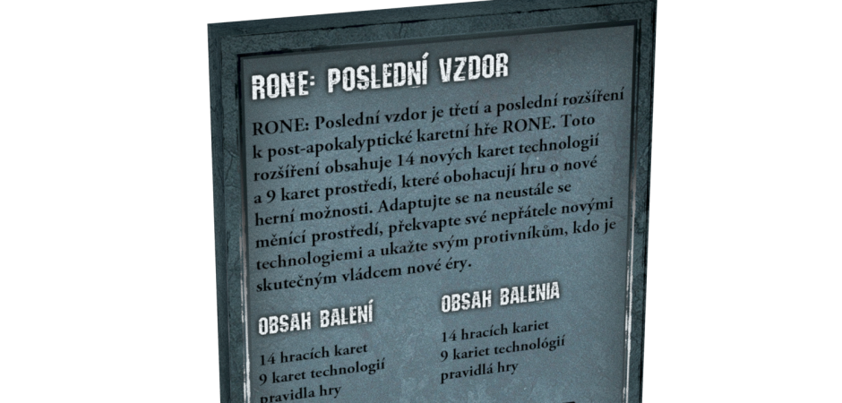 RONE: Poslední vzdor je třetí a poslední rozšíření do post-apokalyptické karetní hry českého autora Štěpána Štefaníka. Kromě 14 nových technologií obsahuje i 9 velkých karet prostředí, které výrazně obohacují hru o nové možnosti. Adaptujte se na neustále se měnící prostředí, překvapte své nepřátele novými technologiemi a ukažte svým protivníků, kdo je skutečným vládcem nové éry.