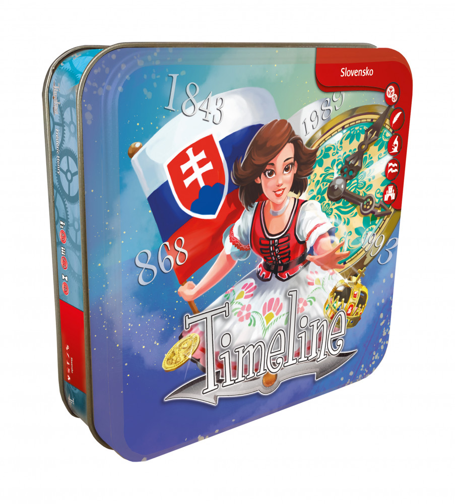 Timeline: Slovensko je zábavná hra pro všechny, kdo mají rádi historii. Hráči se střídají v tazích a na časovou osu postupně přidávají kartičky s důležitými okamžiky českých dějin - historické události, umělecká díla, stavby a další. Tento díl je speciálně zasazen do slovenských reálií. Myslíte si, že správné zařazení kartičky je snadné? Tipnete si správně, kdy byla objevena Dobšinská ledová jeskyně? A kdy vznikla slovenská hymna? Hra Timeline je zabalena v krásné kovové krabičce a proto jistě udělá radost jako dárek!